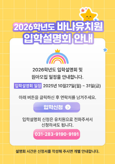 상호 : 바나유치원   TEL: 031)280-9190[9191]   주소 : 경기도 용인시 기흥구 마북로 112
